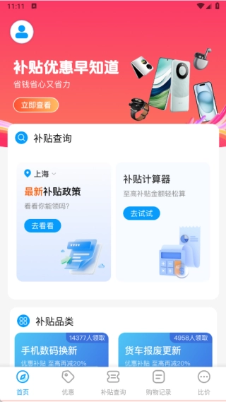 首页设有最新补贴政策、补贴计算器、手机数码以旧换新、货车报废更新、汽车置换补贴等功能板块。