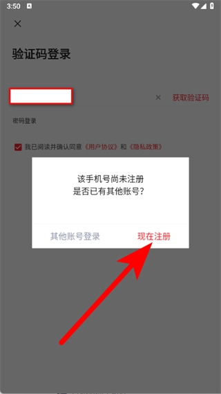 在提示框里选择“现在注册”,进入账号注册页面后,输入收到的短信验证码。