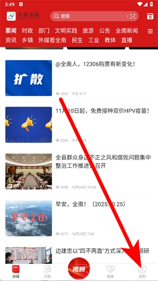 打开大美全南应用,点击底部导航栏中的“我的”选项,即可进入个人中心页面。