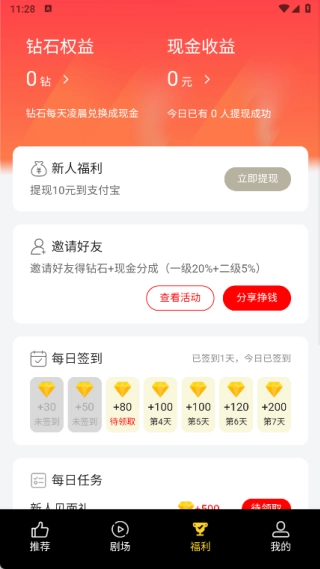 在福利页面,你可以查看钻石收益与现金收益的情况,同时还能了解新人福利、每日签到以及每日任务等相关内容。