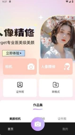 首页提供相机、人像精修、证件照、转格式等功能操作,还可查看作品集。