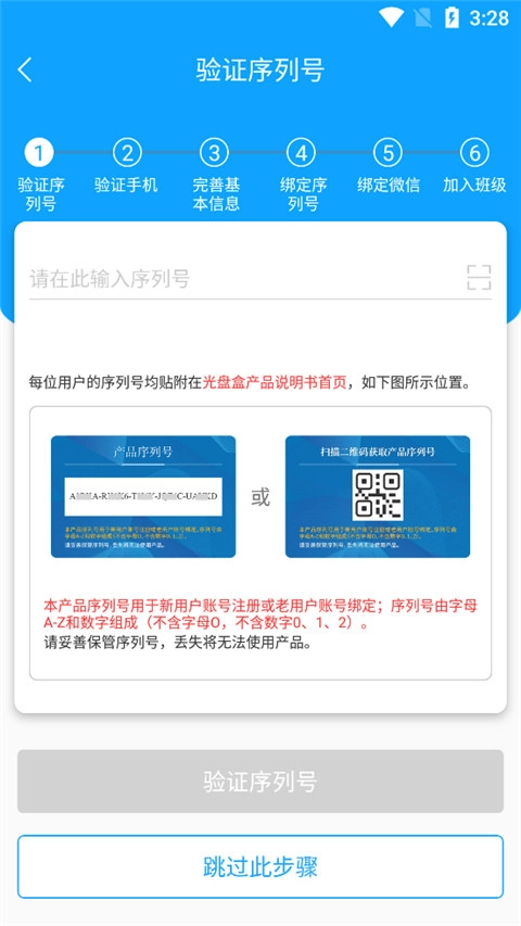 ② 依据操作规范完成注册流程,若没有序列号和班级码,可选择跳过该步骤。