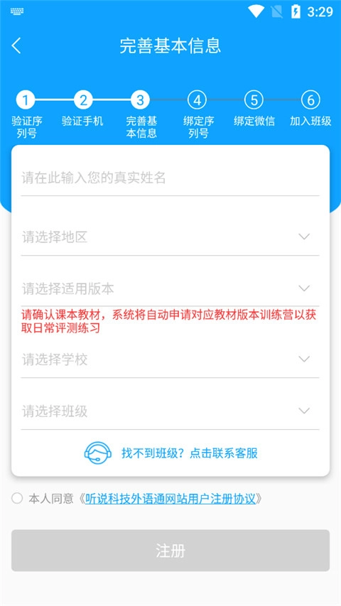 完善个人基本信息,包括姓名、学校、地区、班级等内容,勾选同意注册协议后,点击注册按钮即可完成注册流程。