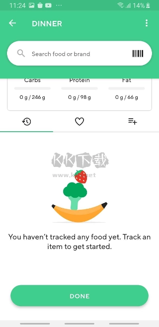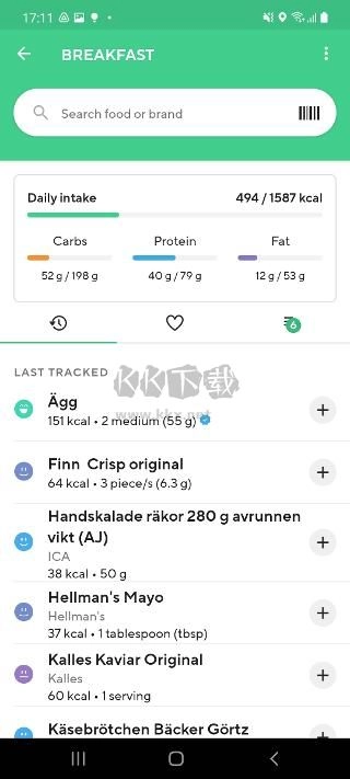 和昨天一样:当您希望跟踪和之前相同的食物时,这部分功能会很实用——您能找到日记里记录的所有食物,只需点击右侧的“+”就能完成跟踪。