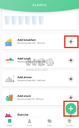 点击“日记”板块右下角的“+”号,接着挑选需要进行跟踪的膳食项目。