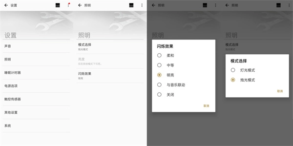 通过终端可以直观地对音箱和灯光进行设置,在灯光设置界面中,能够看到多种灯光效果的调节选项。