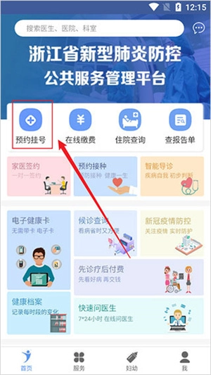 打开健康义乌最新版进入首页,点击“预约挂号”。