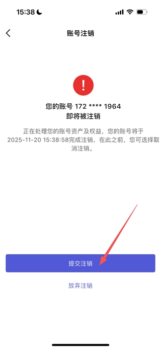 在注销确认页面,点击提交注销按钮,即可完成账号注销流程。