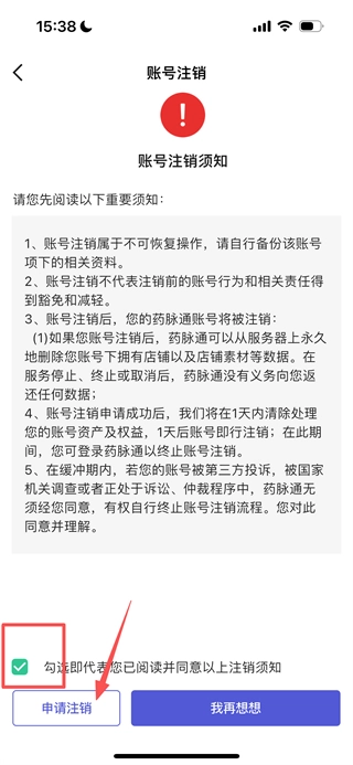 在账号注销须知页面勾选相关选项后,点击“申请注销”按钮,即可进入注销确认页面。
