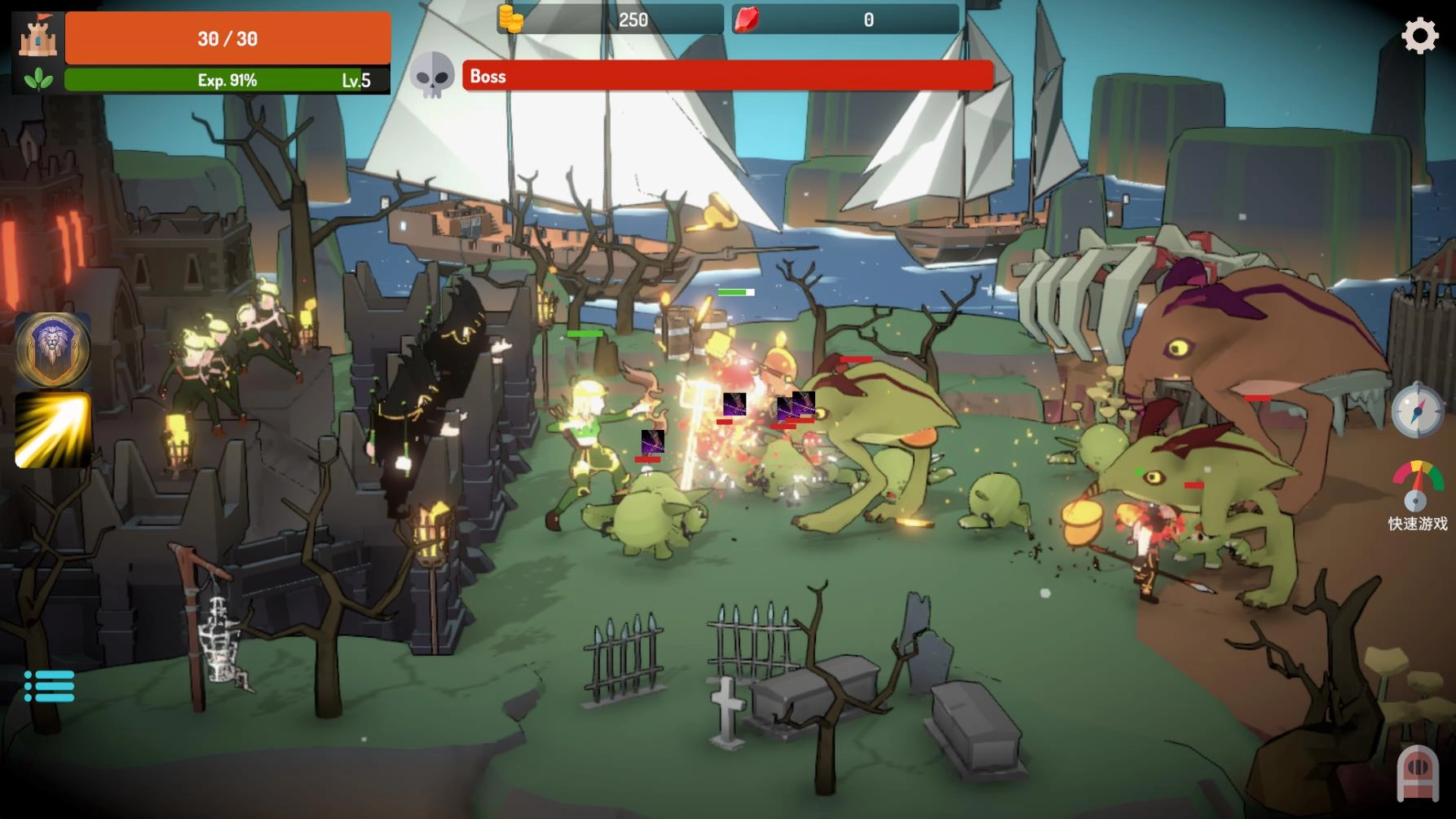 购买好小兵后点击回合开始按钮进入闯关,英雄与小兵会自动对出现的敌人发起攻击。
