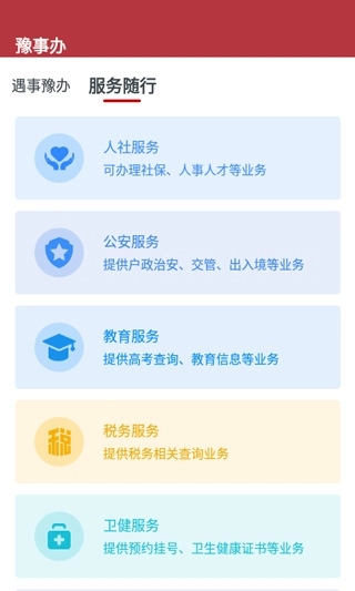 豫事办是一款专为河南人民打造的便民软件。该软件不仅拥有简约舒适的用户界面,还具备十分强大的功能。用户可在软件内完成预约挂号、缴纳社保、补交账单等操作;并且每次接受服务后,还能对服务进行打分评价。有需要的小伙伴们,赶紧来体验吧。