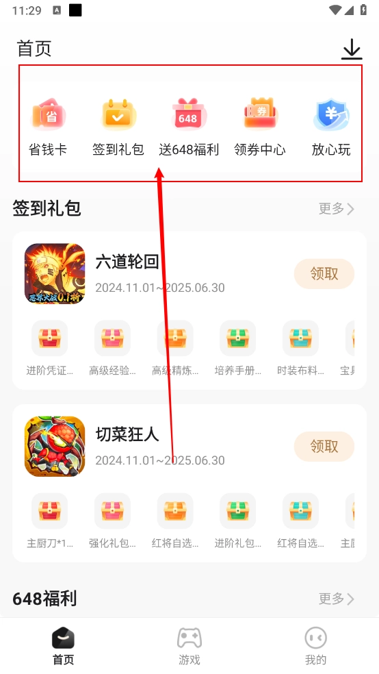 然后进入游戏详情页查看代金券和礼包资源,点击""按钮。