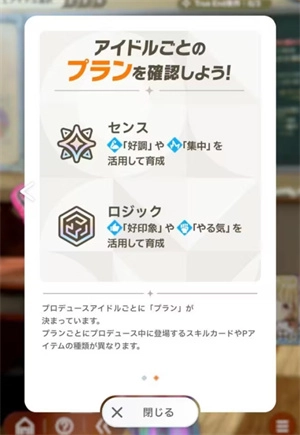 每位偶像都拥有一份明确制作方向的“计划”。计划分为“感性”和“逻辑”两类,对应的技能卡与物品种类存在差异。顺便说明一下,目前已知莉莉娅、広、琴音属于“逻辑”类型的偶像,而咲季、手毬、莉波、清夏、麻央则归为“感性”类型的偶像。