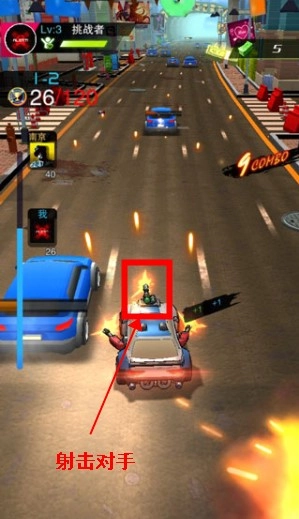 游戏开始后,玩家可点击界面完成射击操作,也能通过滑动屏幕来操控赛车的行驶方向。