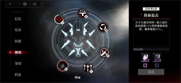 当我们获得重复的禁闭者时,会转化为对应的幻象。幻象用于解锁禁闭者的枷锁,一共有6段,1~3段需要1个幻象,4~5段需要2个幻象,6段需要4个幻象。解锁枷锁将会使禁闭者获得新的小被动效果。※ 后阶段所需的幻象已确定会下调,到时候养成就更简单了。