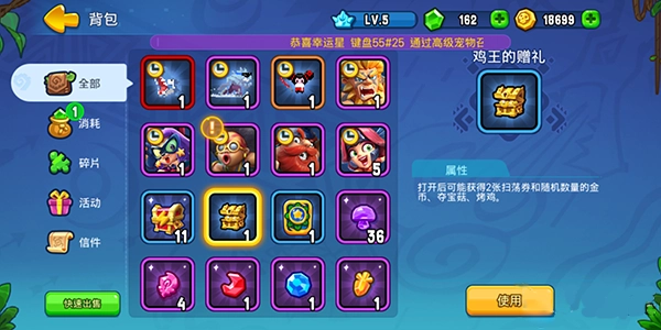 玩家可以在背包里查看自己持有的碎片、消耗品等各类道具。背包中的时效宠物和时效英雄虽有使用时间限制,但仍能进行英雄觉醒操作。而且下次使用该英雄时,会继承之前的觉醒星级,所以玩家完全可以放心培养自己喜欢的英雄!