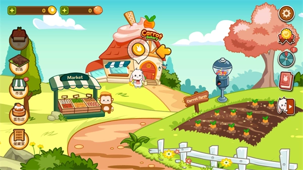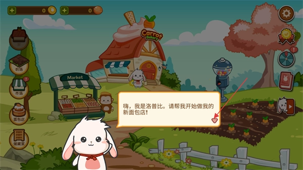 进入游戏主界面后,能看到农场之类的功能建筑,按照洛普比的请求进行互动,就能开启CarrotBakery的面包店经营流程。