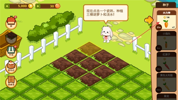 在农场的田地区域任选一块土地,播下大力神胡萝卜种子,按照提示种好三棵胡萝卜并完成浇水,就能继续推进当前的种植流程了。