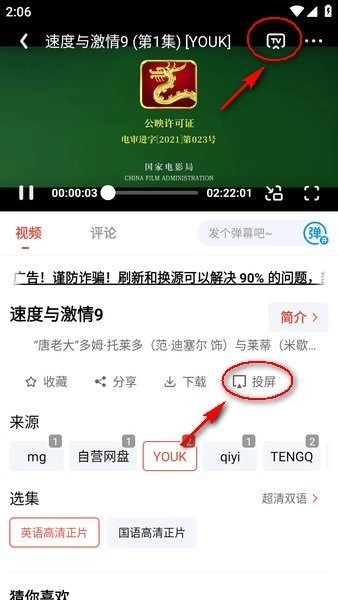 接着就会进入播放页面,此时可以点击右上角的“TV”按钮,也可以选择点击中间的“投屏”按钮。