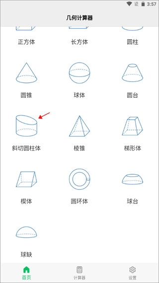 打开几何计算器后,会呈现出各式各样的几何模型,我们以斜切圆柱体为例,点击该模型即可。