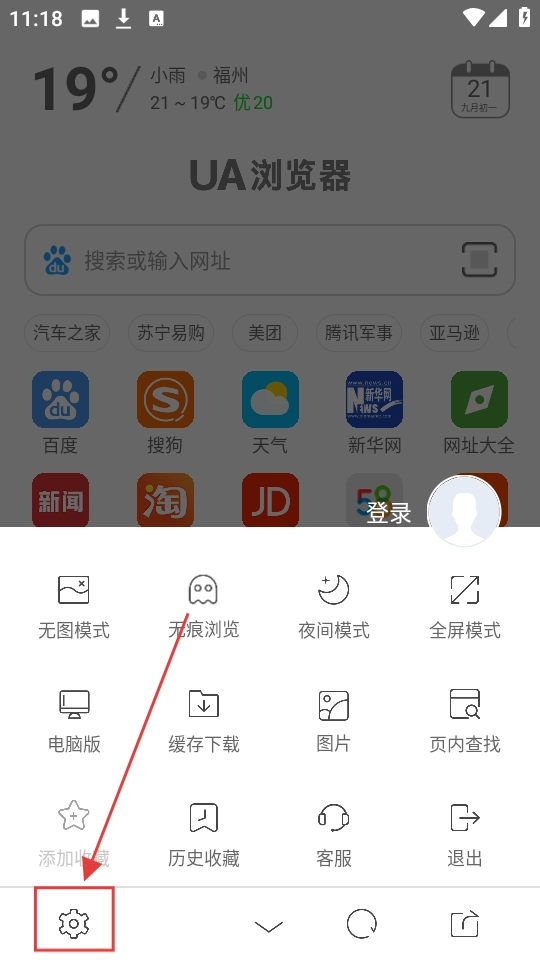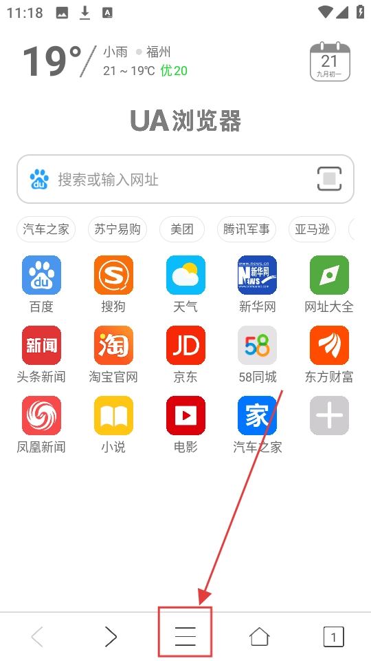 我们打开UA浏览器后,要是想进行设置方面的操作,只需点击底部的菜单按钮,功能菜单就会展开了。