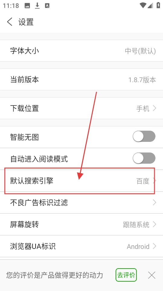 进入设置界面后,要是想设置默认搜索引擎,点击【默认搜索引擎】这个选项,就可以进入搜索引擎选择页面啦。