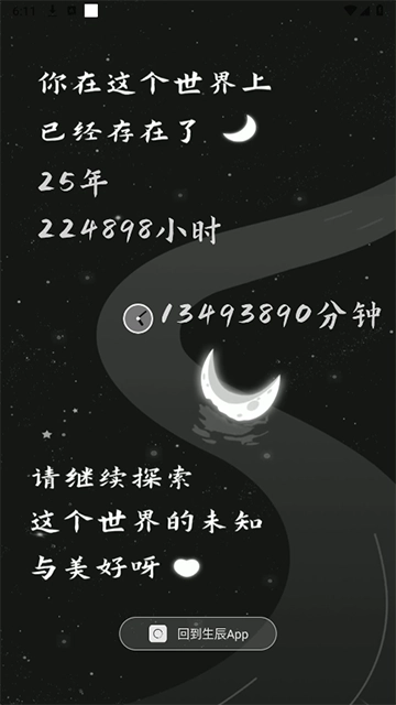 生辰界面设计得十分简洁,给人一种清新雅致的感觉。打开软件后,首先需要选择自己的出生日期,调整确认无误后就能进入“生之时”页面,这里会清晰地展示出你来到这个世界上所经历的年、月、周、天、小时以及分钟的具体数量。