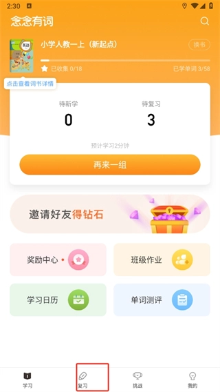 马上打开应用,进入首页后点击切换至【复习】页面。