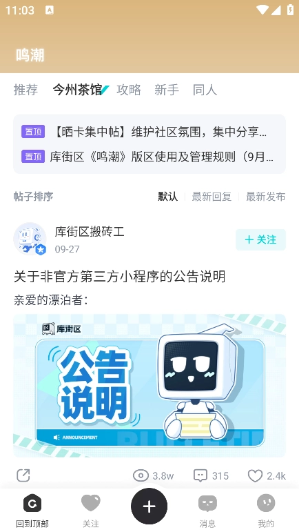 用户可在主界面的推荐、今州茶馆、同人等栏目里浏览各类帖子,进行帖子浏览操作。