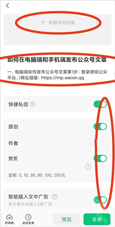 按照提示执行以下步骤:添加封面图片、设置文章标题、撰写内容摘要、配置广告位、声明原创属性、填写作者信息等,全部完成后点击页面右下角的“发表”按钮,即可结束文章的发布流程。