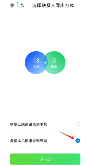 要是第一次进行备份操作,就选择“把本机通讯录备份到云端”这个选项,这样能保证所有联系人都被保存到云端服务器里。