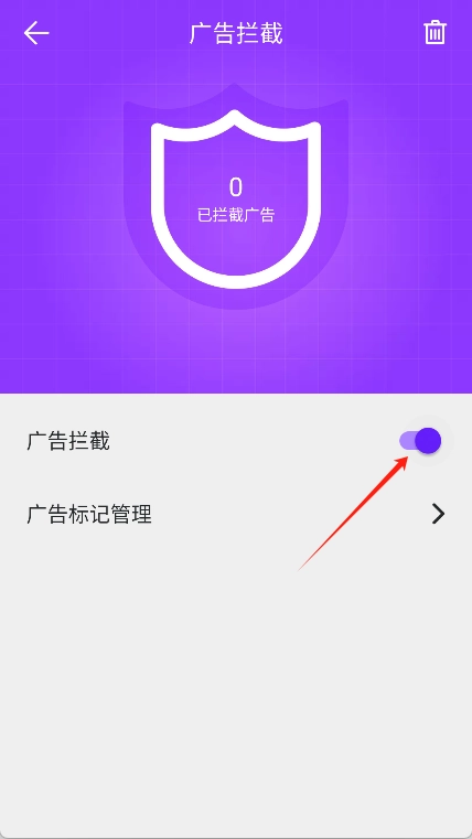 开启该功能的操作步骤为:找到“广告拦截”选项,点击其右侧的开关按钮,当开关从灰色转变为紫色时,即代表功能已成功开启。