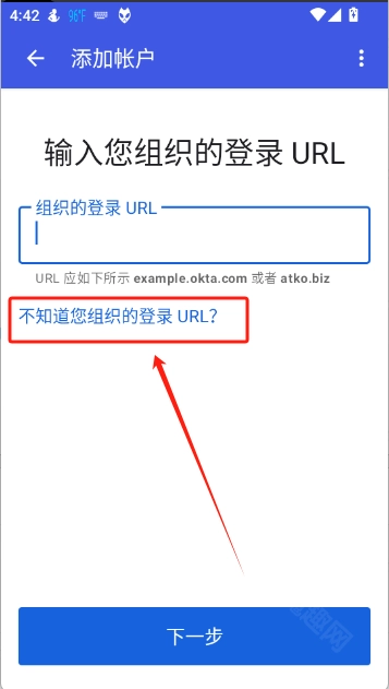 选择登录后,需输入组织的登录URL,接着点击“下一步”按钮。