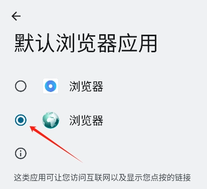 在随即弹出的页面里点击“浏览器应用”,进入之后将web浏览器设置为默认浏览器。