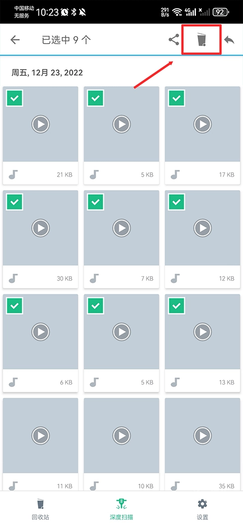 先批量勾选需要删除的文件,再点击右上角的垃圾桶按钮
