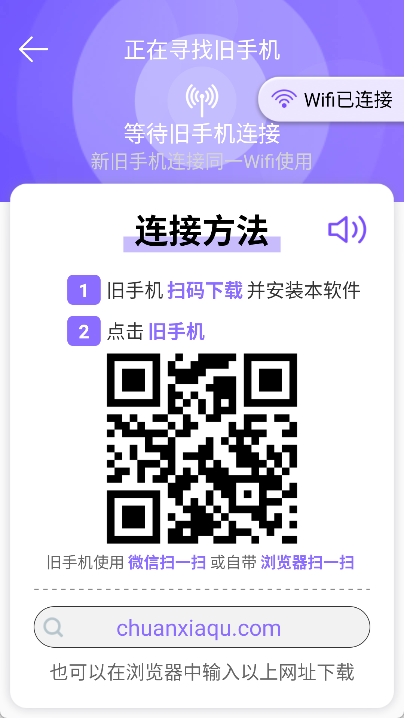 新手机会生成一个二维码,你可以用旧手机扫描该二维码,也可以让旧手机连接新手机创建的WLAN热点。