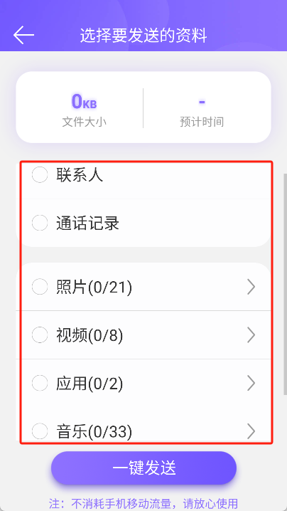 连接成功后,在旧手机上挑选需要迁移的数据类别,像联系人、短信这类,接着点击“一键发送”按钮。