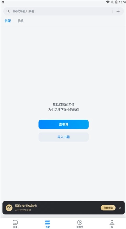 点击书架功能具备两种作用,一是前往书城,二是导入书籍。