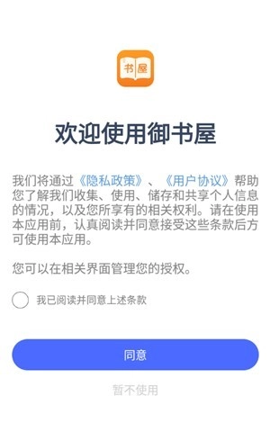 首先在本站安装“御书屋(自由的小说阅读器)”,首次进入软件界面时,需阅读对应的隐私协议,若确认无误,点击同意即可开始使用。