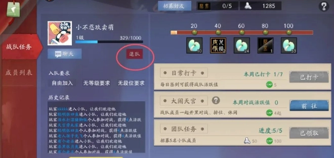 6、要是所在的战队没什么活跃度,直接点击退队按钮,就能重新去加入新的战队了