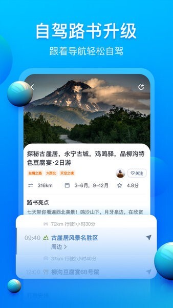 这款软件在推荐自驾游目的地时,不仅涵盖热门景点,还会兼顾对山水风光、人文底蕴与古村落的挖掘探索。