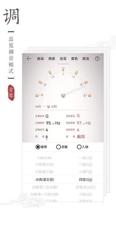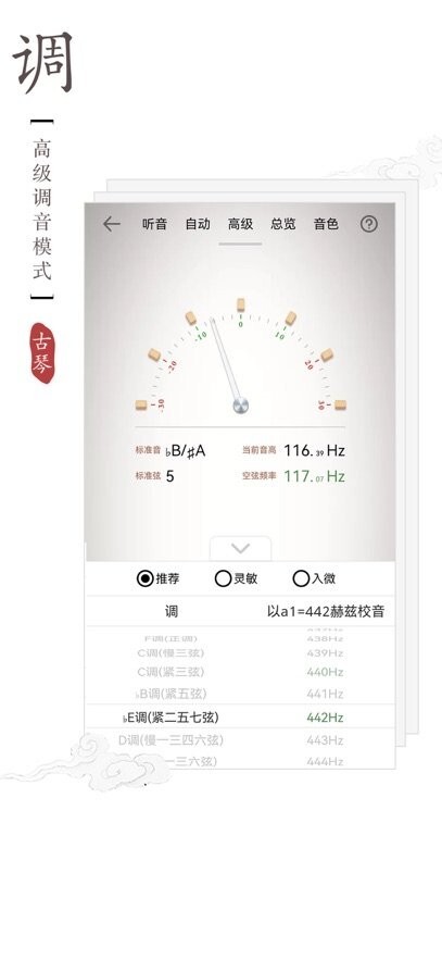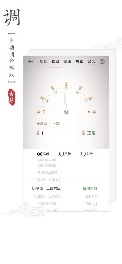 这是一款用于感受民族乐器的调音工具,了丰富的古琴调式,能够适配各类乐谱的弹奏需求;它采用多种音准测试算法,通过综合分析声音来校正音准。