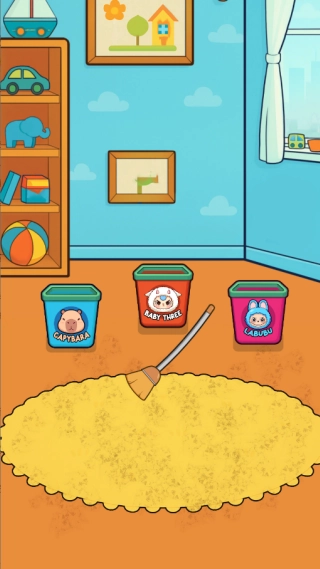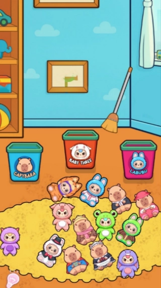3、在整理关卡里,首先要把地毯上的玩偶依据图案分类,放进对应的收纳桶中,接着用扫把清扫污渍,按照分类清扫的顺序逐步推进。