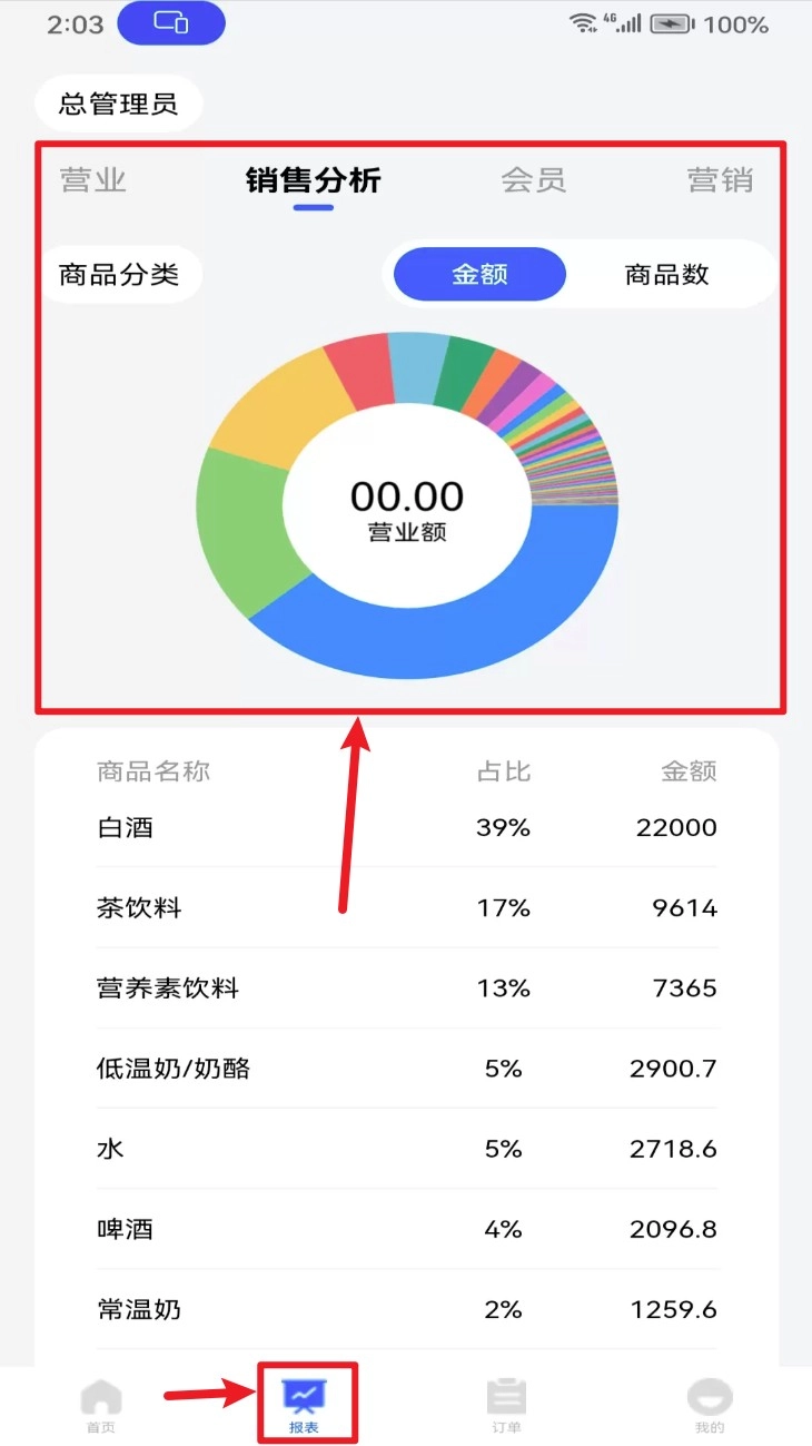 切换至报表页面后,能够查看销售分析图表以及商品分类营收情况,系统支持通过金额或者商品数量这两种方式进行查看。