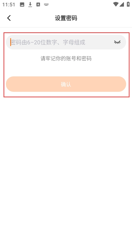 4、进入设置密码的页面后,根据提示输入由6-20位数字与字母组合而成的密码,接着点击【确认】按钮,即可完成密码设置。