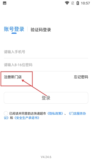 在门店账号登录页面,点击【注册新门店】选项,即可进入门店注册流程,同时需勾选同意相关协议才能完成登录操作。