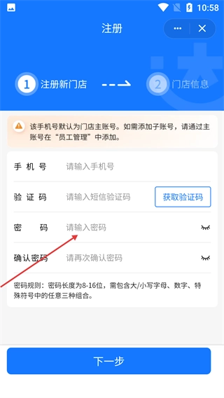 在新门店注册页面,依次填写【手机号】、【验证码】和【密码】(密码需符合8至16位且包含三种不同字符的要求),全部填写完毕后点击“下一步”按钮。