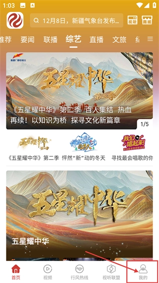 在应用首页点击底部的【我的】按钮,即可进入个人中心页面;首页包含综艺、直播等内容板块。