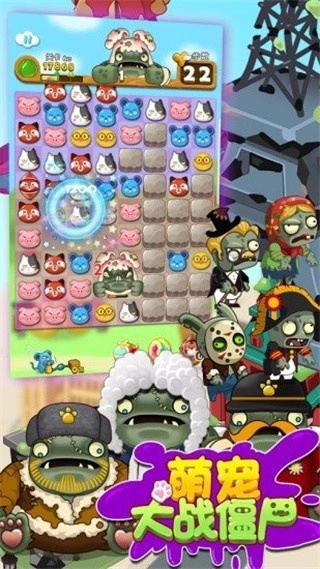 1、经典的消除玩法中融入了僵尸与萌宠元素,玩家需要通过消除萌宠来对僵尸发起攻击。