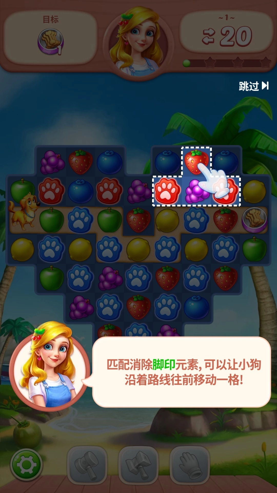 2、玩家需移动相同颜色的元素,成功消除水果后狗狗就能向前迈一步。